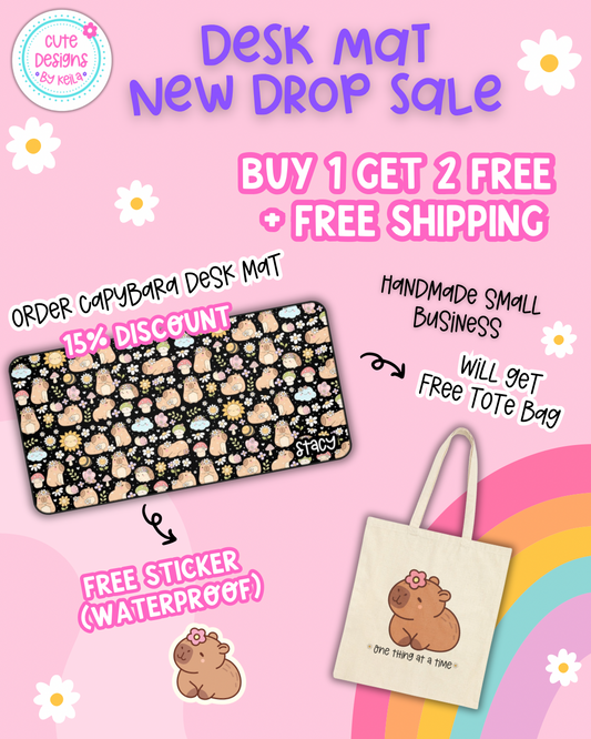 Cute Capybara Desk Mat with Floral Design (black)- Cute Personalized Desk Mat | Includes Free Tote Bag & Sticker (waterproof)
