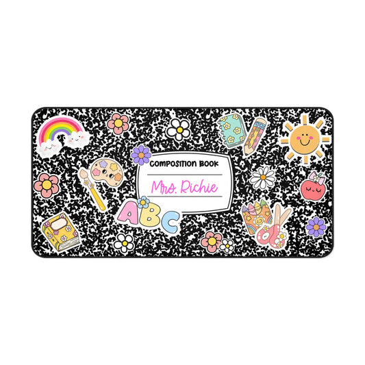 Cute Composition Book Desk Mat for Teachers, Personalized Office Decor, Classroom Gift, Rainbow and Sunshine Design