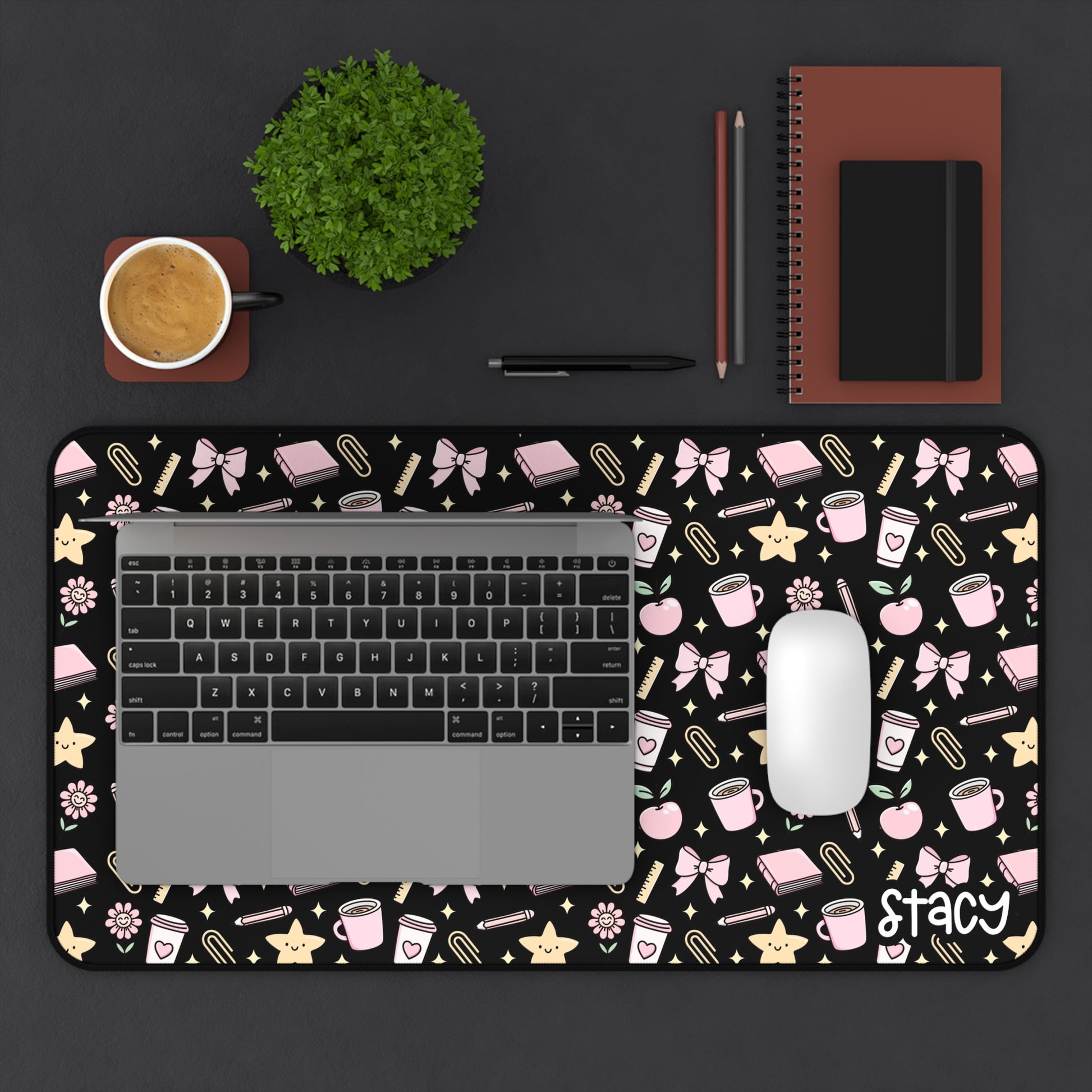 Cute Teacher Themed Desk Mat Black, Charming Desk Mat with Cute Stationery Design, Office Decor, Custom Desk Accessories, Gift for Students, Aesthetic Work Space