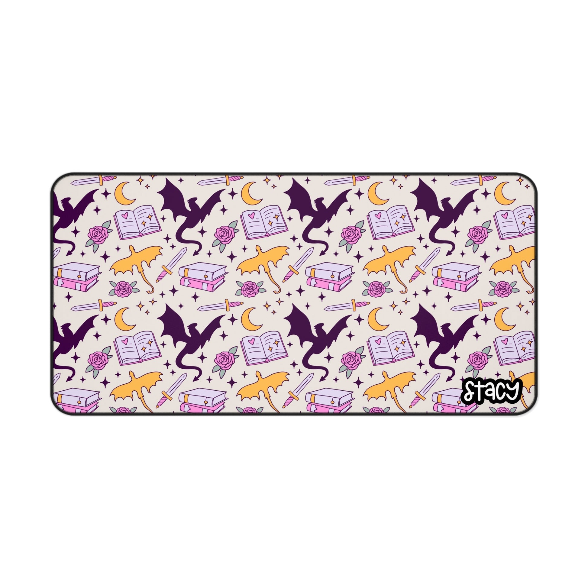 Fantasy and romantasy themed desk mat and mouse pad, perfect for adding a touch of magic to your workspace. Ideal for fantasy lovers and those who enjoy imaginative designs. Relevant for back to school, birthdays, and any occasion for a desk accessory upgrade.
