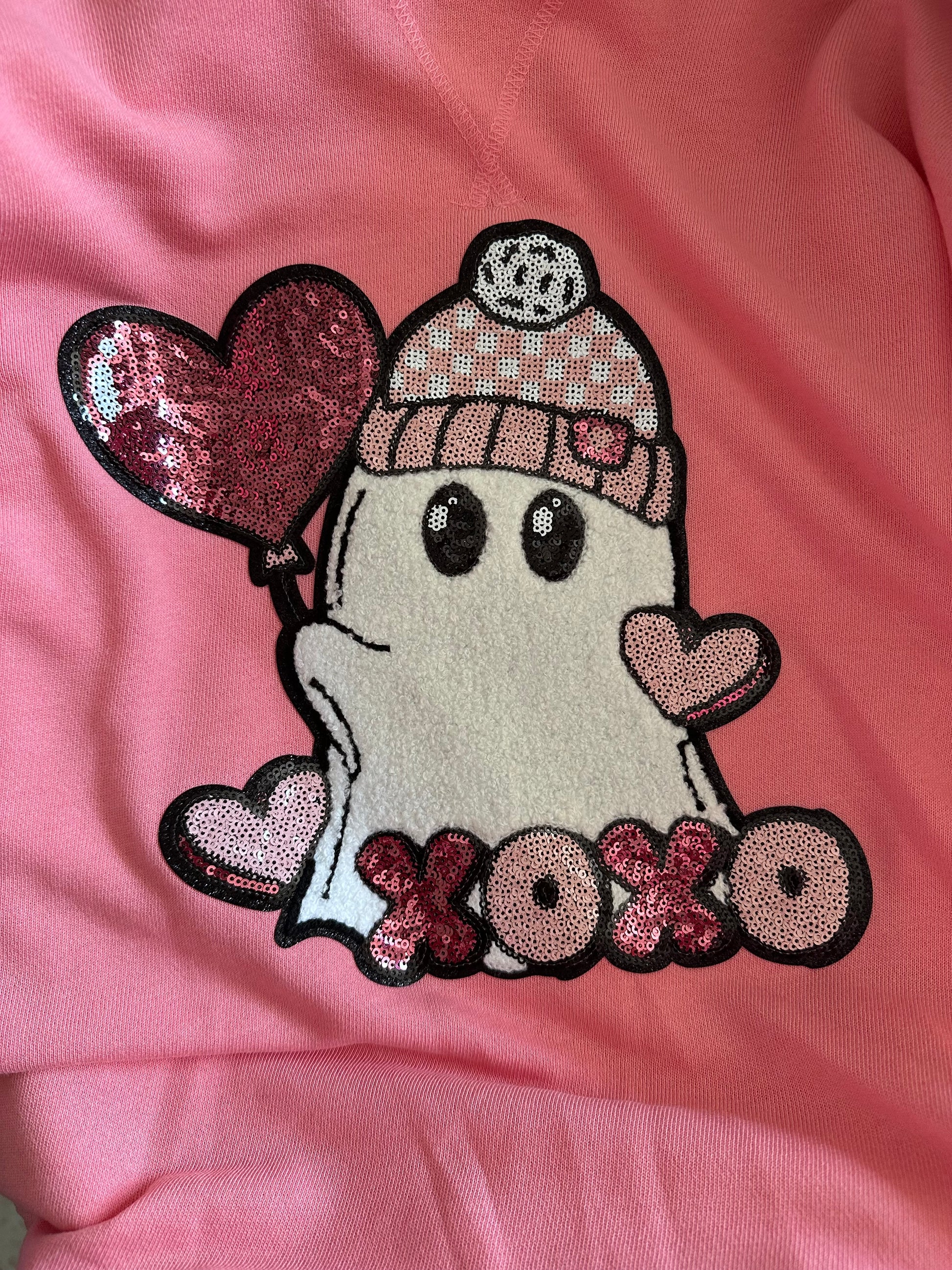 Bring a little sweetness to your wardrobe with this charming ghosty sweatshirt. Featuring an adorable ghost wearing a pink knit hat and holding a glittery heart‑shaped balloon, this cozy pullover blends cute aesthetic vibes with festive flair. The sparkling “XOXO” detail adds the perfect touch of love and whimsy.